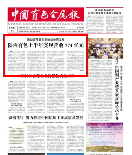 中國有色金屬報(bào)、陜西網(wǎng):推動(dòng)高質(zhì)量和高效益協(xié)同發(fā)展陜西有色上半年實(shí)現(xiàn)營收774億元