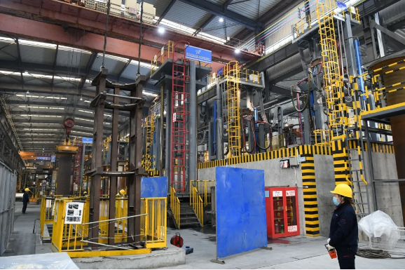 寶鈦集團高品質(zhì)鈦錠、管材、型材生產(chǎn)線項目建設(shè)現(xiàn)場,工人正在吊裝設(shè)備