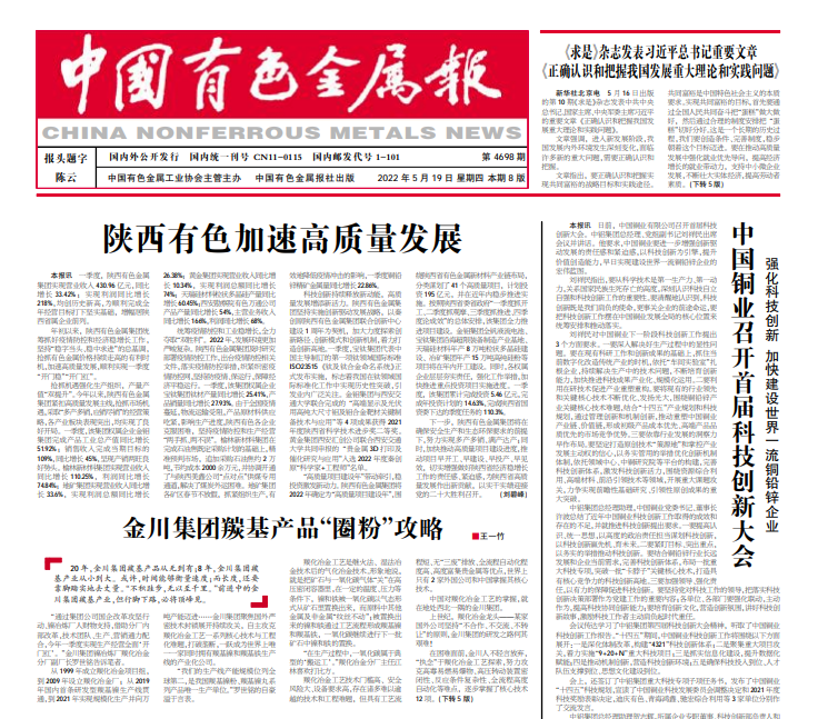 科技創(chuàng)新持續(xù)釋放新動能,高質量發(fā)展增添新活力。陜西有色金屬集團堅持實施創(chuàng)新驅動發(fā)展戰(zhàn)略,以秦創(chuàng)原陜西有色金屬集團聯(lián)合創(chuàng)新中心建設1周年為契機,加大力度探索創(chuàng)新路徑、創(chuàng)新模式和創(chuàng)新機制,著力打造創(chuàng)新高地。一季度,寶鈦集團代表中國主導制訂的第一項鈦領域國際標準ISO23515《鈦及鈦合金命名系統(tǒng)》正式發(fā)布實施,標志著我國在鈦領域國際標準化工作中實現歷史性突破,引發(fā)業(yè)內廣泛關注。金鉬集團與西安交通大學聯(lián)合完成的“高端顯示及光伏用高純大尺寸鉬及鉬合金靶材關鍵制備技術與應用”等4項成果獲得2021年度陜西省科學技術進步獎二等獎。黃金集團西安匯創(chuàng)公司聯(lián)合西安交通大學共同申報的“貴金屬3D打印及催化研究與應用”入選2022年度秦創(chuàng)原“科學家+工程師”名單。