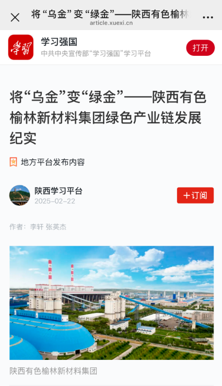2月22日,中共中央宣傳部“學習強國”學習平臺連續(xù)刊發(fā)兩篇報道介紹了榆林新材料集團2024年生產(chǎn)經(jīng)營和綠色產(chǎn)業(yè)鏈發(fā)展情況