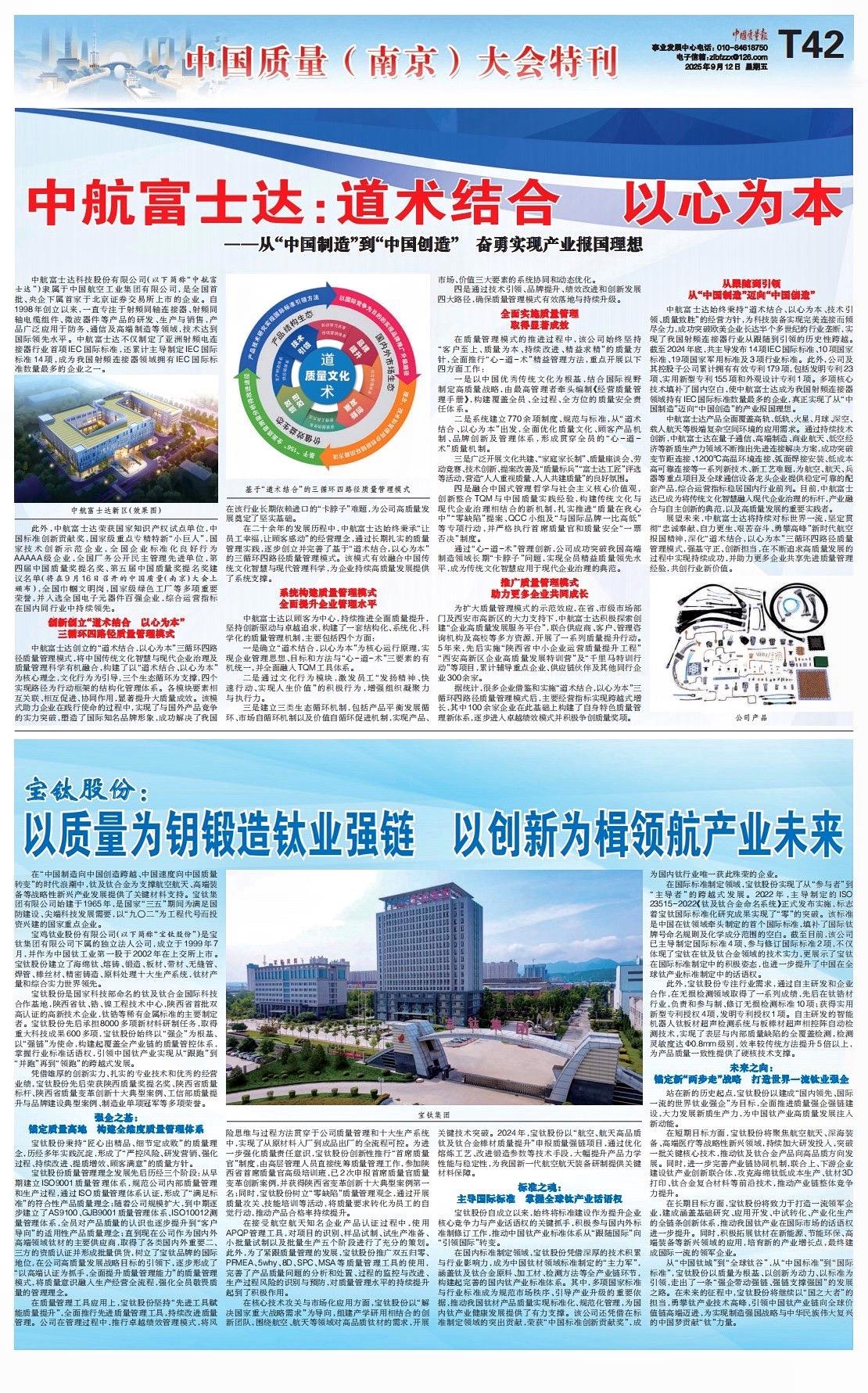 9月16日,中國(guó)質(zhì)量大會(huì)在江蘇省南京市正式開(kāi)幕?!吨袊?guó)質(zhì)量報(bào)》推出的大會(huì)特刊,以《以質(zhì)量為鑰鍛造鈦業(yè)強(qiáng)鏈 以創(chuàng)新為楫領(lǐng)航產(chǎn)業(yè)未來(lái)》為題,對(duì)寶鈦股份近年來(lái)質(zhì)量強(qiáng)企強(qiáng)鏈工作進(jìn)行了深度報(bào)道。