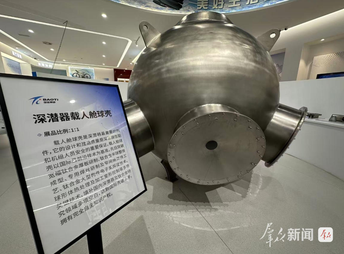 9月23日,走進(jìn)寶鈦集團(tuán),展覽館內(nèi)碩大的深潛器載人艙球殼模型將時(shí)間線拉回5年前。2020年11月,裝有寶鈦研制生產(chǎn)的鈦合金載人球艙的“奮斗號(hào)”載人潛水器在馬里亞納海溝成功坐底10909米,創(chuàng)造我國(guó)載人深潛的新紀(jì)錄。