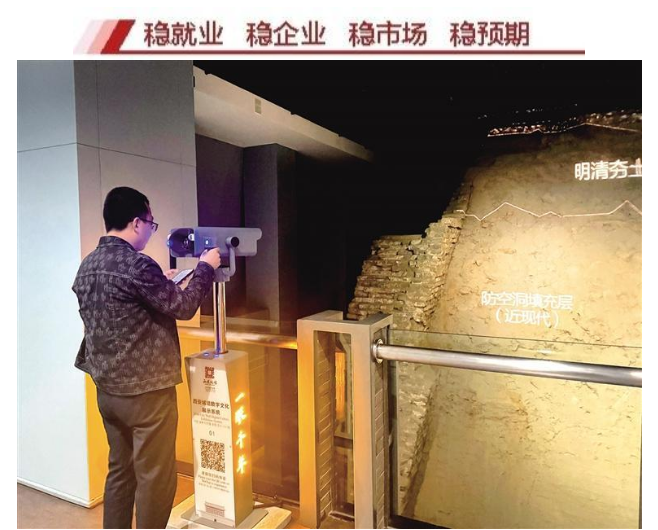 9月24日,在西安唐皇城墻含光門遺址博物館,城墻斷面遺址前游客往來穿梭。不少游客手扶現(xiàn)場的AR望遠(yuǎn)鏡操控桿,透過數(shù)字鏡頭觀賞眼前的古城墻,領(lǐng)略千年前長安城的繁華景象。