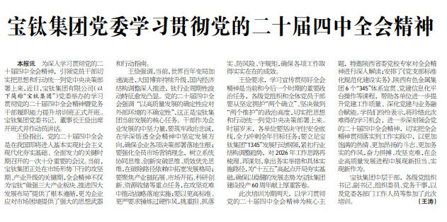 王儉要求,學(xué)習(xí)宣傳貫徹好全會精神是當(dāng)前和今后一個(gè)時(shí)期的重要政治任務(wù),各級黨組織和全體黨員干部要從堅(jiān)定擁護(hù)“兩個(gè)確立”、堅(jiān)決做到“兩個(gè)維護(hù)”的政治高度,切實(shí)把思想和行動統(tǒng)一到黨中央決策部署上來。時(shí)屆歲末,各單位要堅(jiān)決守住安全底線,全力沖刺全年目標(biāo)任務(wù);要立足寶鈦集團(tuán)“1345”發(fā)展行動綱領(lǐng),緊扣行業(yè)結(jié)構(gòu)調(diào)整趨勢,對2026年工作思路再梳理、再謀劃,拿出務(wù)實(shí)舉措和具體實(shí)施路徑,為“十五五”高起點(diǎn)開局夯實(shí)基礎(chǔ),確保以穩(wěn)健的發(fā)展態(tài)勢為寶鈦集團(tuán)建設(shè)投產(chǎn)60周年獻(xiàn)上厚重答卷。