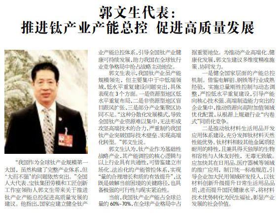 “我國(guó)作為全球鈦產(chǎn)業(yè)規(guī)模第一大國(guó),雖然構(gòu)建了完整產(chǎn)業(yè)體系,但‘大而不強(qiáng)’的問(wèn)題依然突出?!比珖?guó)人大代表、寶鈦集團(tuán)勞模和工匠創(chuàng)新工作室領(lǐng)銜人郭文生帶來(lái)關(guān)于推進(jìn)鈦產(chǎn)業(yè)產(chǎn)能總控促進(jìn)高質(zhì)量發(fā)展的建議。他指出,國(guó)家應(yīng)建立健全鈦產(chǎn)業(yè)產(chǎn)能總控體系,引導(dǎo)全國(guó)鈦產(chǎn)業(yè)健康可持續(xù)發(fā)展,助力我國(guó)在全球鈦行業(yè)競(jìng)爭(zhēng)格局中搶占戰(zhàn)略主動(dòng)地位。