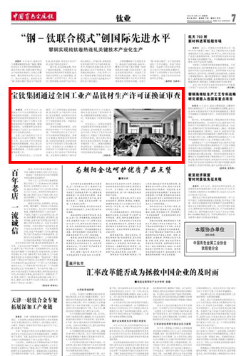 8月5日~6日,由國(guó)家生產(chǎn)許可認(rèn)證管理機(jī)構(gòu)4名專家組成的審查組,分別對(duì)寶鈦集團(tuán)和寶鈦股份所涉及的有關(guān)生產(chǎn)單位和部門進(jìn)行了為期2天的現(xiàn)場(chǎng)審查和產(chǎn)品抽樣檢測(cè)。根據(jù)審查情況,寶鈦集團(tuán)和寶鈦股份順利通過了全國(guó)工業(yè)產(chǎn)品鈦材生產(chǎn)許可證的換證審查。
