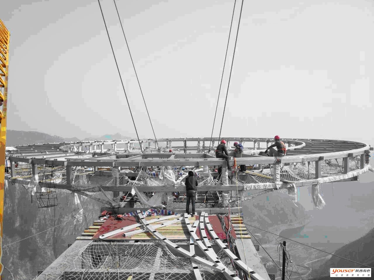 在制作成型并預(yù)組裝合適后,將鈦主體結(jié)構(gòu)分段成16塊,進(jìn)行每一塊重量計(jì)算,確保弦長(zhǎng)不超過(guò)11米,重量不超過(guò)3噸,為便于運(yùn)輸,在山底通過(guò)貨索分段運(yùn)輸?shù)缴巾?,最終在山頂上拼裝成一個(gè)整體。現(xiàn)場(chǎng)焊接安裝也是該公司負(fù)責(zé)。由8名員工進(jìn)行現(xiàn)場(chǎng)作業(yè)。焊接現(xiàn)場(chǎng)位于北京平谷區(qū)一座海拔786米的山頂,對(duì)焊工水平要求極高,在距崖底400米高空,工人走到焊接部位要從很窄的橫梁上通過(guò),對(duì)于恐高的人來(lái)說(shuō)障礙比較大。領(lǐng)隊(duì)李曉軍說(shuō):“由于山上早上風(fēng)小,為了能早點(diǎn)開工,住在山腳下民房里的工人們每天清晨4點(diǎn)半就要出發(fā),要坐十幾分鐘的纜車,還要爬半個(gè)小時(shí)山路才能到達(dá)施工現(xiàn)場(chǎng),等到山頂上天就亮了?,F(xiàn)場(chǎng)高空焊接條件艱苦,人只能坐到容納一個(gè)人的吊籃里,整個(gè)人懸掛到半空中作業(yè),山上風(fēng)大,吊籃隨風(fēng)擺動(dòng),里面的工人作業(yè)難度可想而知。焊接時(shí)如果有風(fēng)會(huì)產(chǎn)生氧化,焊接過(guò)程中必須無(wú)風(fēng)或者風(fēng)速很小,為了正常作業(yè)只有將吊籃外部用塑料布包起來(lái),里面的焊工經(jīng)常由于缺氧而頭暈。山頂紫外線強(qiáng),而且工作時(shí)沒(méi)有可以遮陰的地方,工人們頂著烈日,才幾天臉上就被曬爆了皮。為了搶工期,午飯只能在施工現(xiàn)場(chǎng)解決,泡面、饅頭和一份簡(jiǎn)單的菜吃完,下午技術(shù)人員和鉚工及其他焊縫焊接人員還要安排第二天的工作,一直到下午6點(diǎn)才能下山休息。公司員工不畏辛勞的精神確保了該項(xiàng)目的順利完工。”