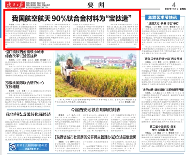 9月5日,記者從省國資委獲悉,作為我國航空航天用鈦合金材料的主要研發(fā)生產(chǎn)基地,陜西有色寶鈦集團(tuán)為我國航空航天產(chǎn)業(yè)提供了90%的鈦合金材料用量,是我國新型戰(zhàn)機(jī)和大飛機(jī)用鈦合金的主要供應(yīng)商。