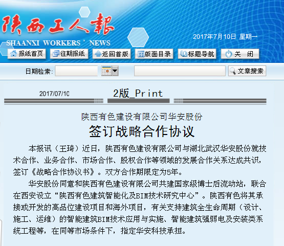 近日,陜西有色建設(shè)有限公司與湖北武漢華安股份(股票代碼430279)基于相互信任、優(yōu)勢互補及戰(zhàn)略布局的考慮,就技術(shù)合作、業(yè)務合作、市場合作、股權(quán)合作等領(lǐng)域的發(fā)展合作關(guān)系達成共識,簽訂《戰(zhàn)略合作協(xié)議書》。雙方合作期限定為5年,即從2017年5月9日到2022年5月9日止。
