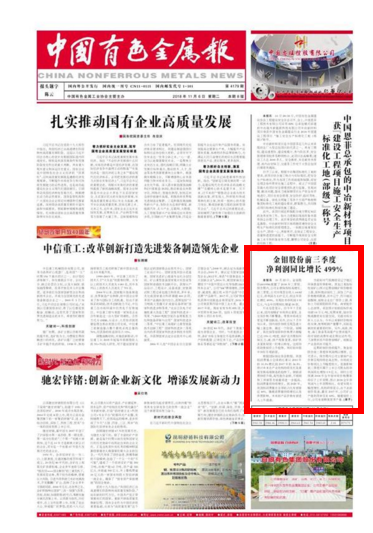 中國有色金屬報、陜西日報:金鉬股份前三季度凈利潤同比增長499%