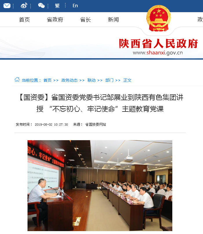 8月1日下午,根據(jù)中央、省委和省國(guó)資委黨委“不忘初心、牢記使命”主題教育部署,省國(guó)資委黨委書(shū)記鄒展業(yè)到陜西有色集團(tuán),以《悟初心、守初心、踐初心,以一流黨建推動(dòng)省屬企業(yè)高質(zhì)量發(fā)展》為題給黨員領(lǐng)導(dǎo)干部上了一堂內(nèi)涵深刻、生動(dòng)精彩的專題黨課。陜西有色集團(tuán)黨委書(shū)記、董事長(zhǎng)馬寶平主持黨課。