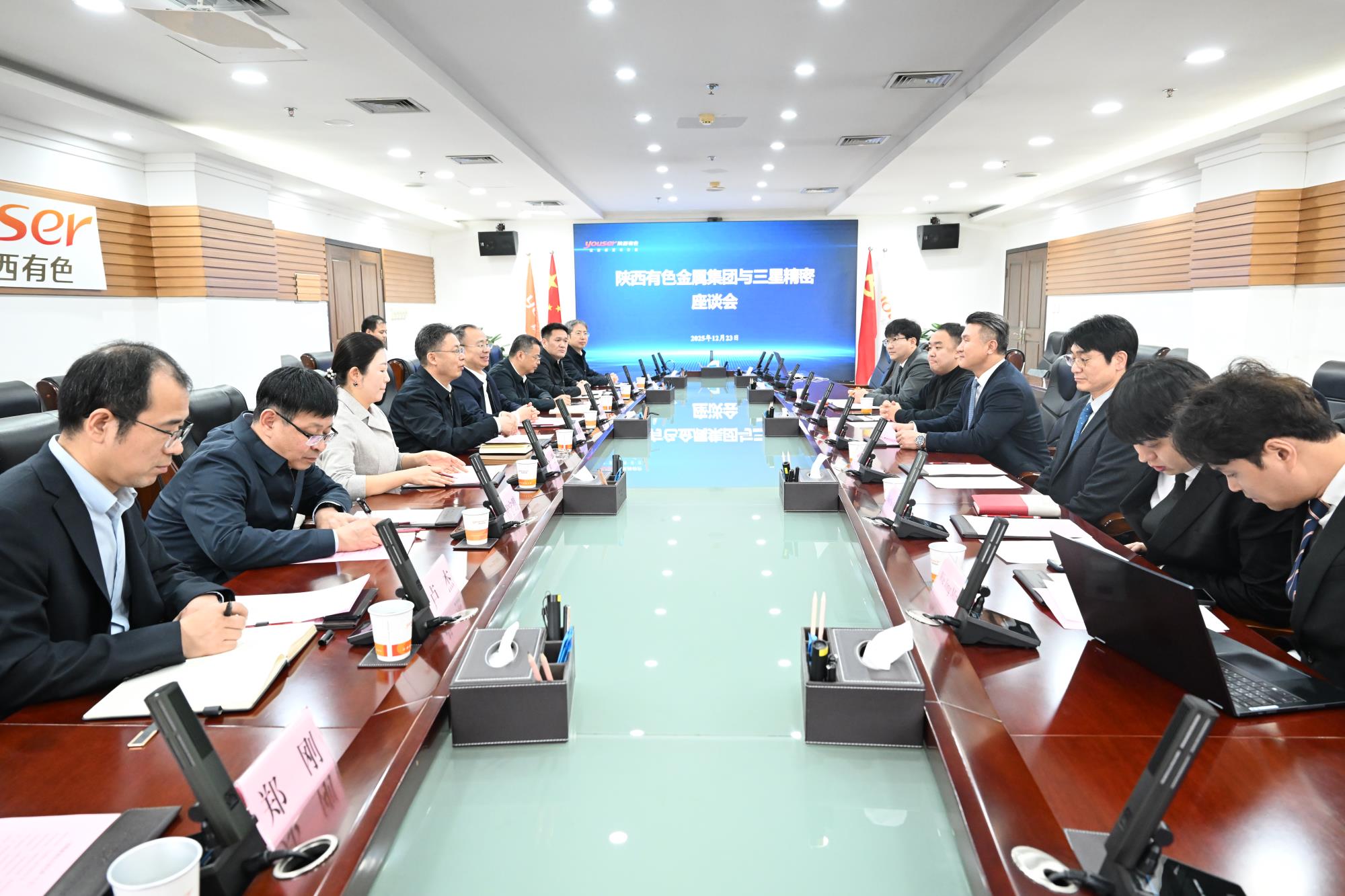 12月23日,陜西有色金屬集團(tuán)黨委書記、董事長吳群英在集團(tuán)總部與三星精密總裁、首席執(zhí)行官Bae Yin Yeol一行圍繞輕量化材料產(chǎn)業(yè)合作、拓展合作領(lǐng)域等座談交流。三星精密管理總經(jīng)理、高級常務(wù)董事Jo Yong Nam,陜西省商務(wù)廳駐韓國代表處總代表金珍,集團(tuán)公司黨委委員、副總經(jīng)理黃忠良參加座談。