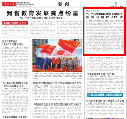 5月1日,中共陜西省委機(jī)關(guān)報(bào)——《陜西日?qǐng)?bào)》在2版(要聞版)顯要位置以《陜西有色集團(tuán)“十二五”以來科技投入超百億 獲專利授權(quán)417項(xiàng)》為題,突出報(bào)道了集團(tuán)公司科技創(chuàng)新成果以及“十二五”以來的科技工作成就。據(jù)悉,5月2日,陜西省人民政府國(guó)有資產(chǎn)監(jiān)督管理委員會(huì)門戶網(wǎng)站《企業(yè)動(dòng)態(tài)》欄目也以頭條形式對(duì)此進(jìn)行了報(bào)道。以下為陜西日?qǐng)?bào)報(bào)道全文。