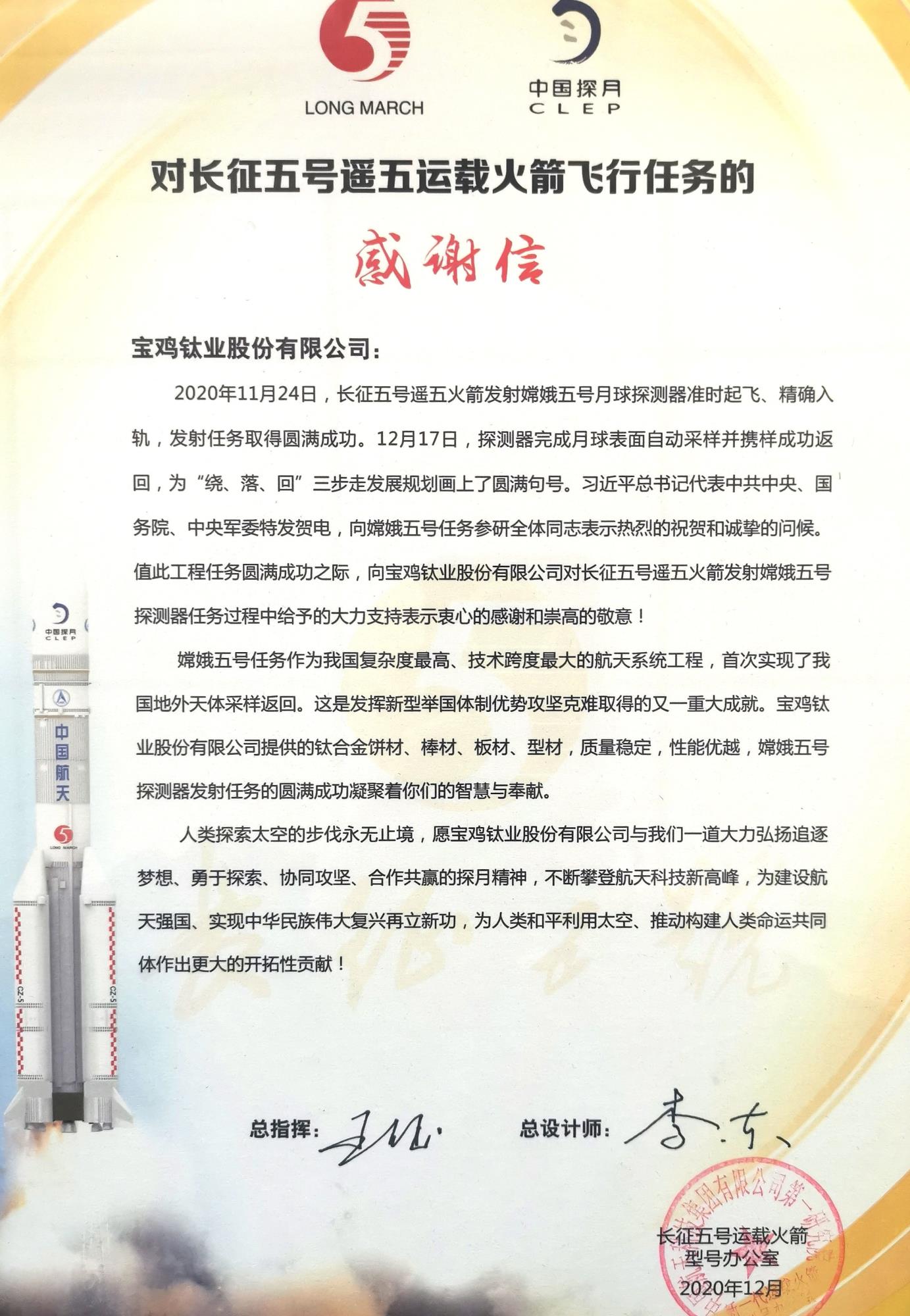 “向?qū)氹u鈦業(yè)股份有限公司對(duì)長(zhǎng)征五號(hào)遙五火箭發(fā)射嫦娥五號(hào)探測(cè)器任務(wù)過(guò)程中給予的大力支持表示衷心感謝和崇高的敬意!……”日前,寶鈦股份收到了來(lái)自長(zhǎng)征五號(hào)運(yùn)載火箭型號(hào)辦公室(中國(guó)探月)的感謝信。