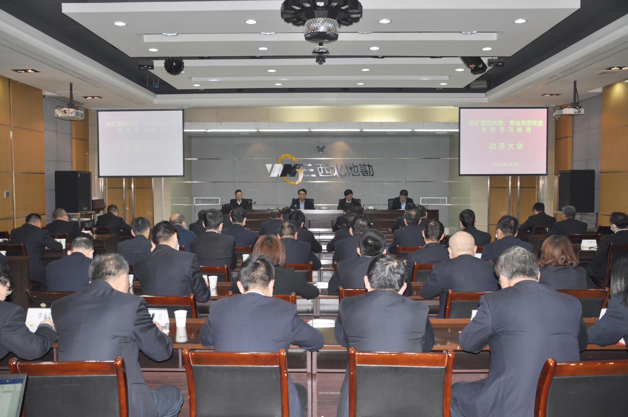 3月8日下午,地礦集團、黃金集團召開黨史學習教育動員大會,認真學習貫徹習近平總書記在黨史學習教育動員大會上的重要講話精神,貫徹落實黨中央、省委、省國資委和陜西有色金屬集團黨委工作要求,結合兩集團實際,動員部署開展黨史學習教育工作。