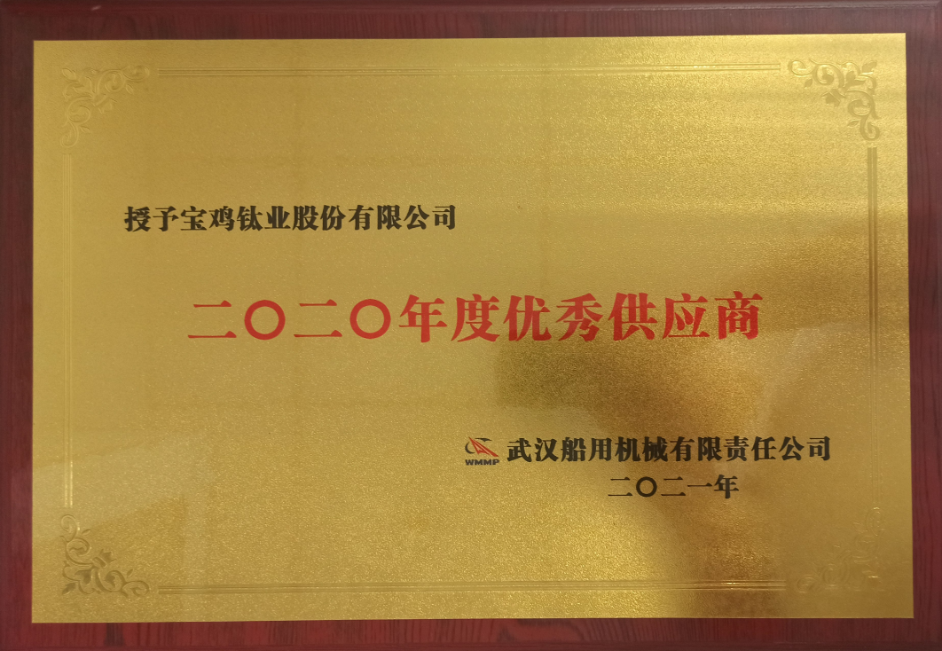 近日,在武漢船用機(jī)械有限責(zé)任公司首次召開(kāi)的供應(yīng)商大會(huì)上,寶鈦集團(tuán)寶鈦股份榮獲其2020年度十大“優(yōu)秀供應(yīng)商”稱號(hào)。寶鈦股份副總經(jīng)理何書林出席會(huì)議并領(lǐng)獎(jiǎng)。
