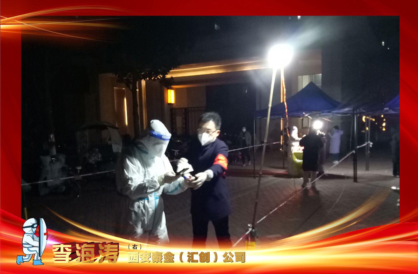 晚上9點(diǎn)多,在延興門社區(qū)海倫國(guó)際小區(qū)值勤的黃金集團(tuán)西安秦金(匯創(chuàng))公司副總經(jīng)理李海濤反復(fù)核實(shí)核酸檢測(cè)信息。夜里氣溫低,他冷的想打哆嗦,手指頭僵硬的像沒(méi)了感覺(jué)。跺跺腳、搓搓手,寒風(fēng)里始終堅(jiān)守著崗位,只為更多的家庭“宅”的放心,睡的安穩(wěn)。