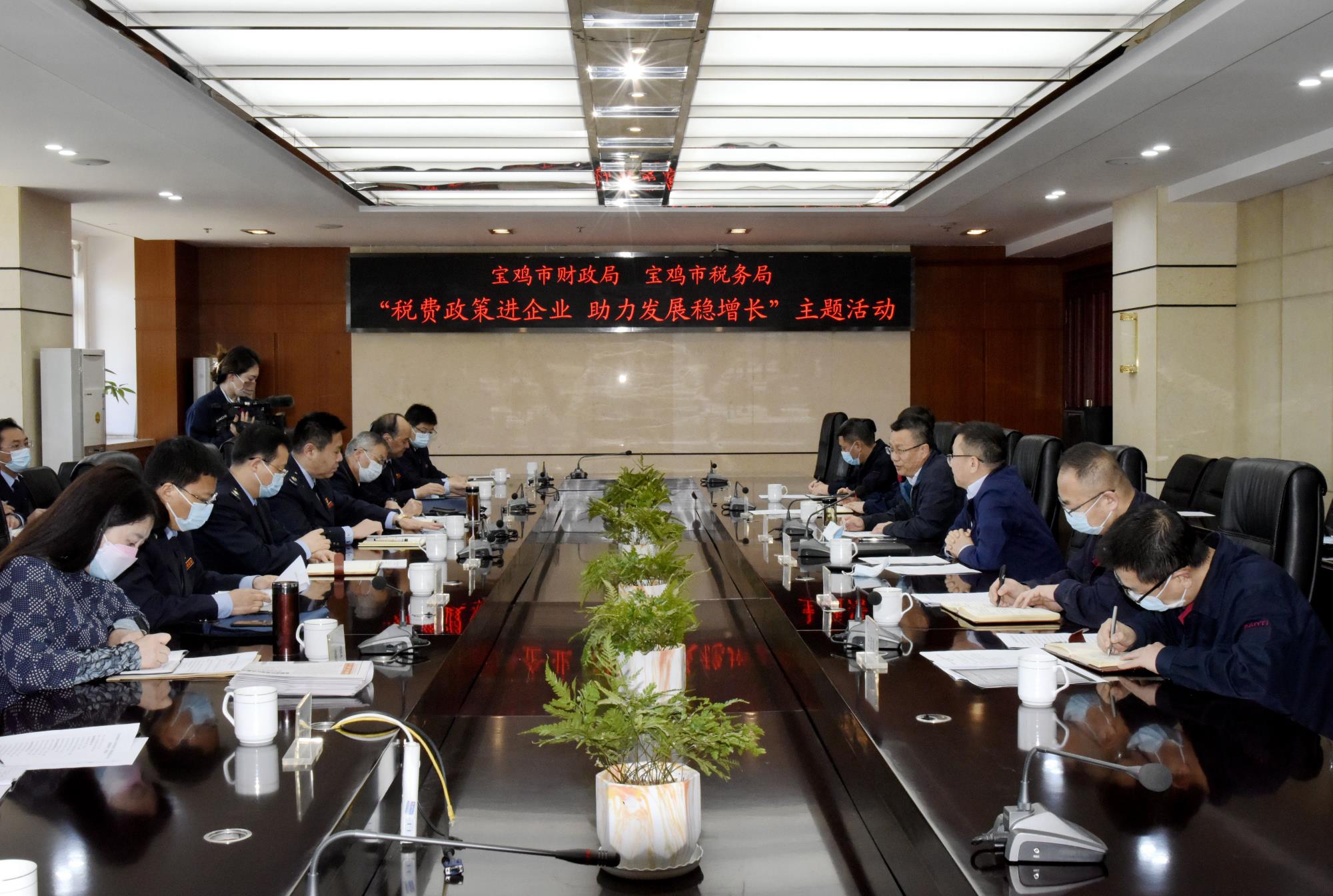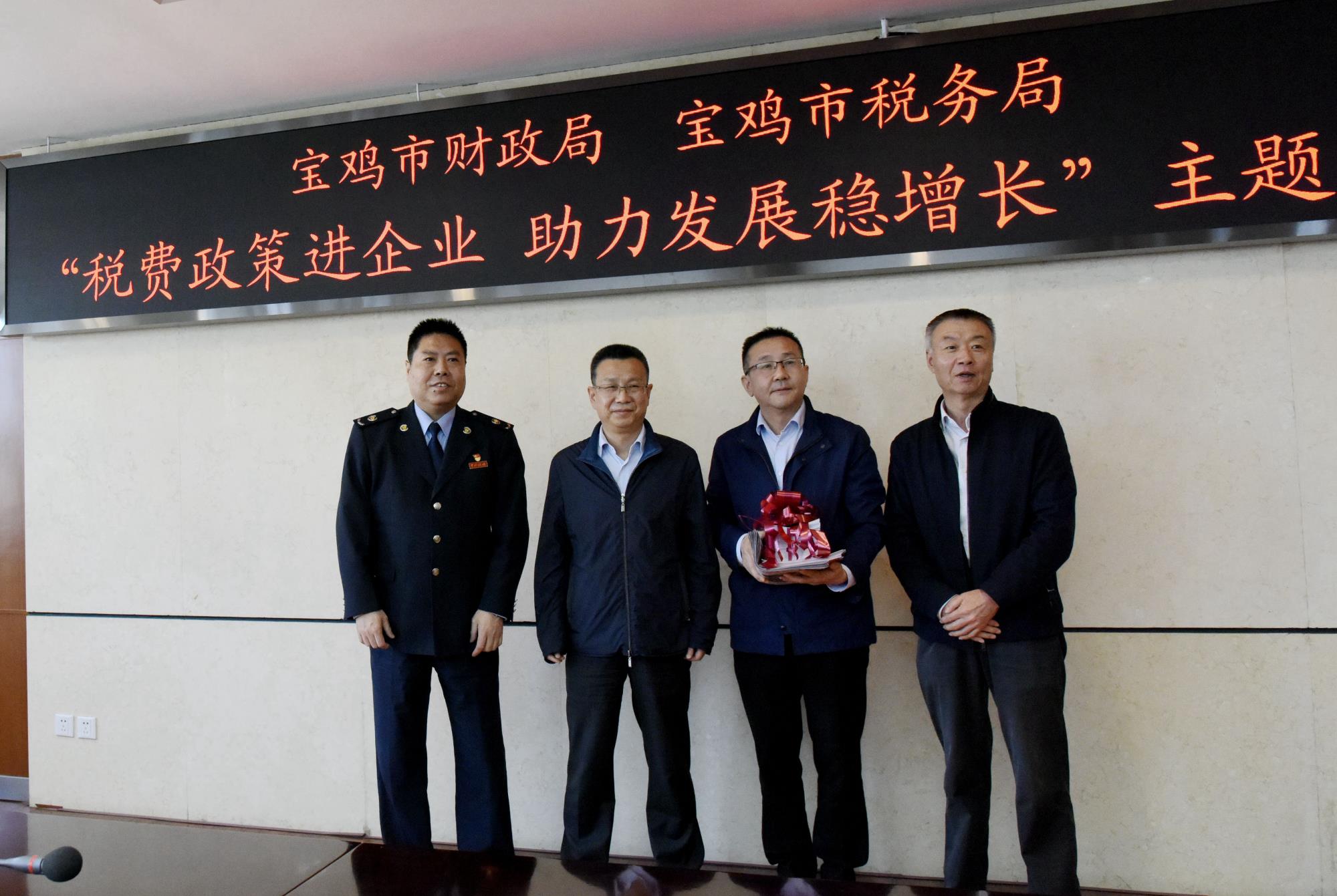 4月25日,寶雞市市稅務(wù)局黨委書(shū)記、局長(zhǎng)程濤,市財(cái)政局黨組成員、副局長(zhǎng)張曄平一行來(lái)到寶鈦集團(tuán),開(kāi)展“稅費(fèi)政策進(jìn)企業(yè) 助力發(fā)展穩(wěn)增長(zhǎng)”主題活動(dòng)。寶鈦集團(tuán)黨委副書(shū)記、總經(jīng)理雷讓岐,總會(huì)計(jì)師余和明及相關(guān)部門(mén)負(fù)責(zé)人參加活動(dòng)。