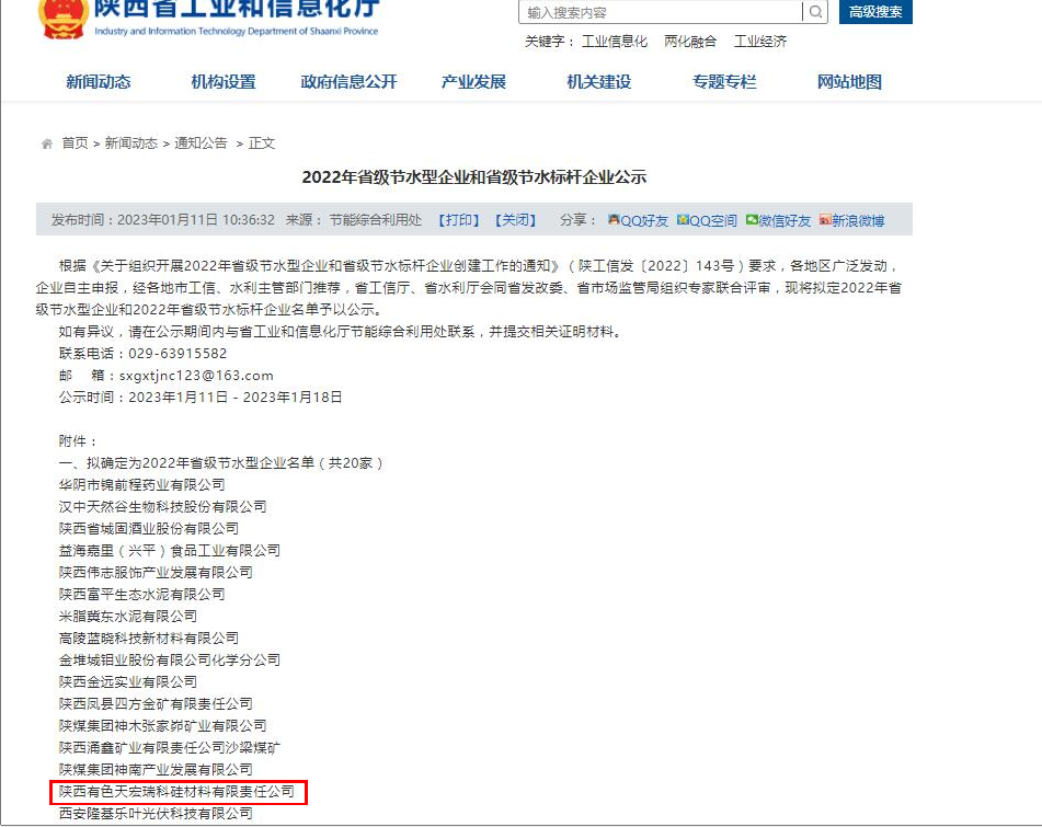 近日,陜西省工業(yè)和信息化廳發(fā)布了《2022年省級節(jié)水型企業(yè)和省級節(jié)水標(biāo)桿企業(yè)公示》名單,經(jīng)榆林市工信、水利主管部門推薦,省工信廳、水利廳會同省發(fā)改委、市場監(jiān)管局組織專家聯(lián)合評審,陜西有色天宏瑞科硅材料有限責(zé)任公司等20家企業(yè)榮獲“2022年省級節(jié)水型企業(yè)”稱號。