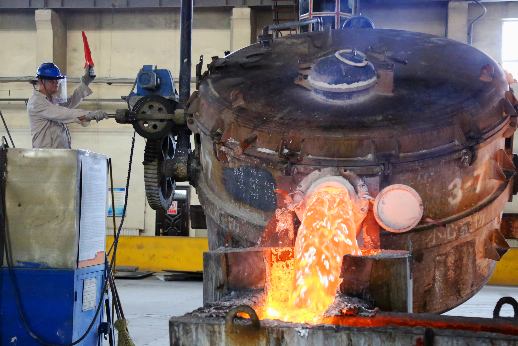 “與其說(shuō)我們悶在鐵盒子里辛苦,其實(shí)真不如鑄造打渣的同事們”,彭師傅自豪的說(shuō)。打渣作業(yè)是整個(gè)電解鋁工序最靠近900多度鋁液操作的,70公分的打渣鏟便是操作的極限距離,厚重的工裝是他們防高溫的唯一措施。