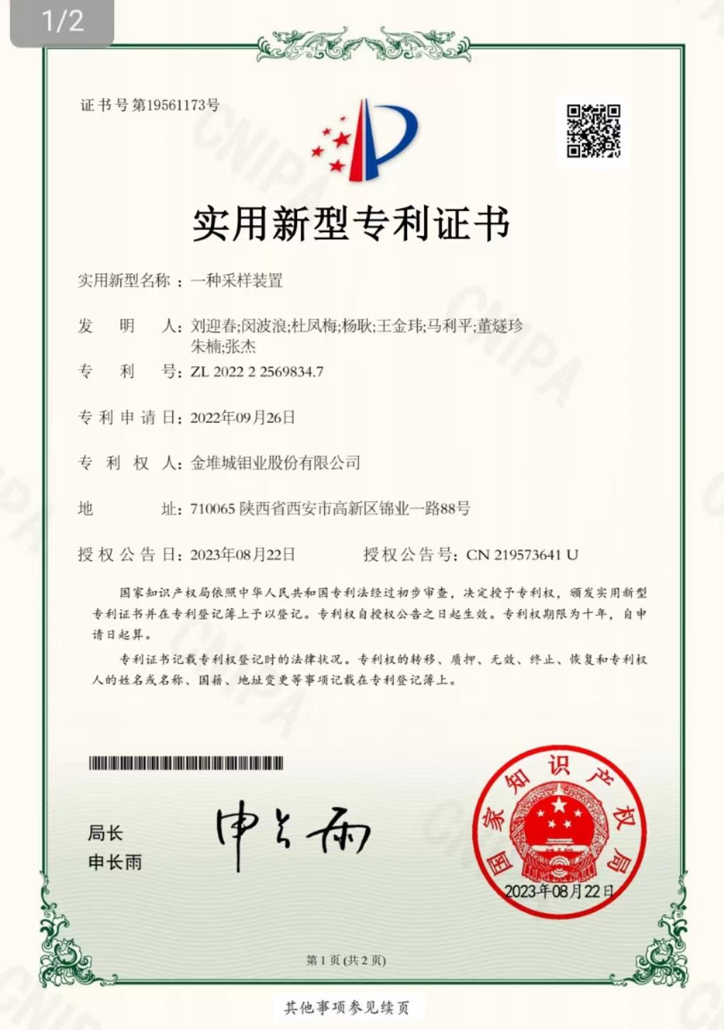 近日,金鉬集團礦山分公司研發(fā)的《一種采樣裝置》被國家知識產(chǎn)權(quán)局授予實用新型專利證書。