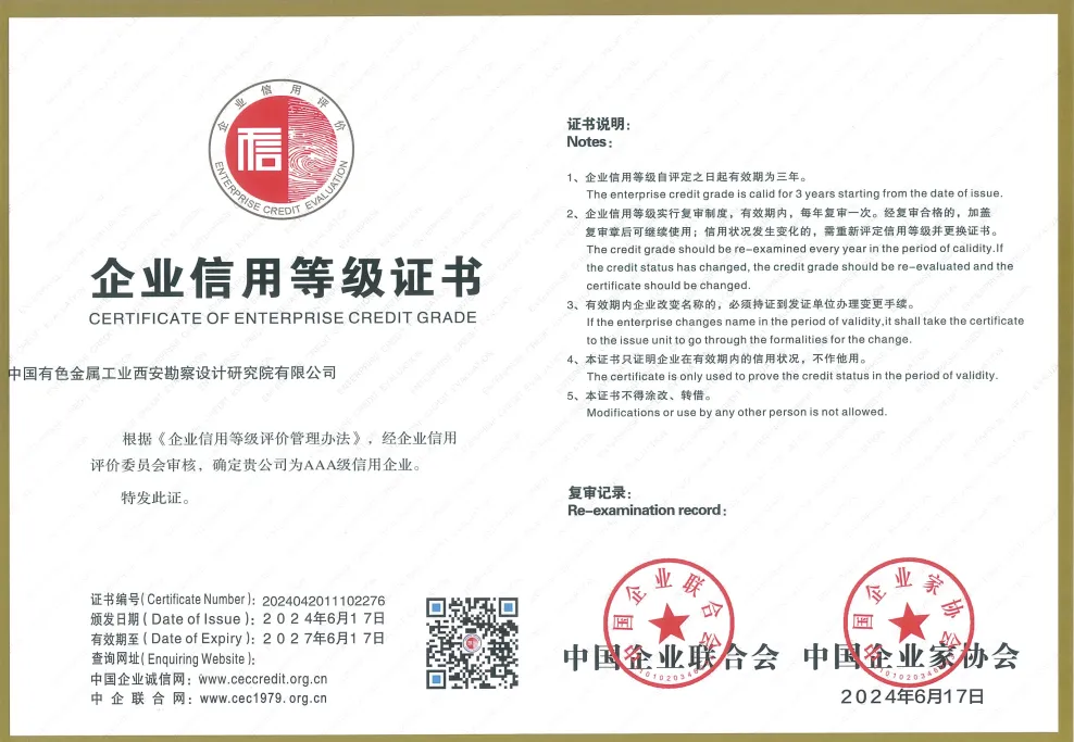 近日,西安勘察設(shè)計(jì)院榮獲由中國企業(yè)聯(lián)合會(huì)和中國企業(yè)家協(xié)會(huì)頒發(fā)的2024年企業(yè)信用評(píng)價(jià)AAA級(jí)信用企業(yè)稱號(hào),為國家企業(yè)信用評(píng)價(jià)最高等級(jí)。