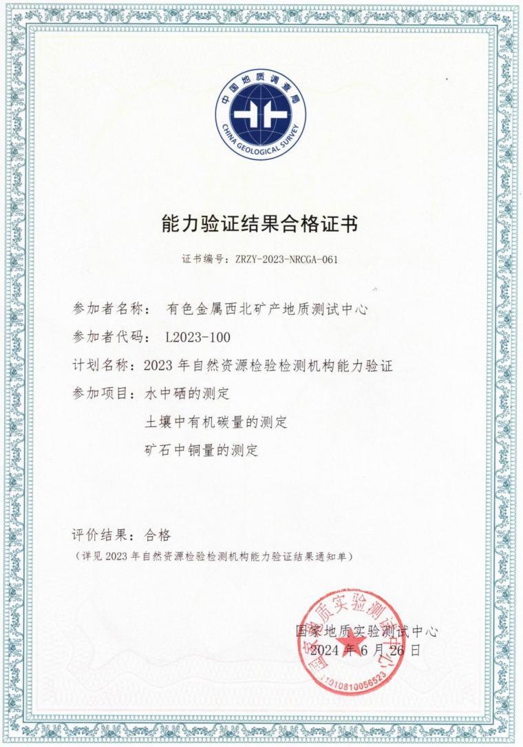 近日,中國地質(zhì)調(diào)查局國家地質(zhì)實驗測試中心公布了2023年自然資源檢驗檢測機構能力驗證考核結果,地礦集團研究院公司參加的水中硒的測定、土壤中有機碳量的測定和礦石中銅量的測定三個項目,測