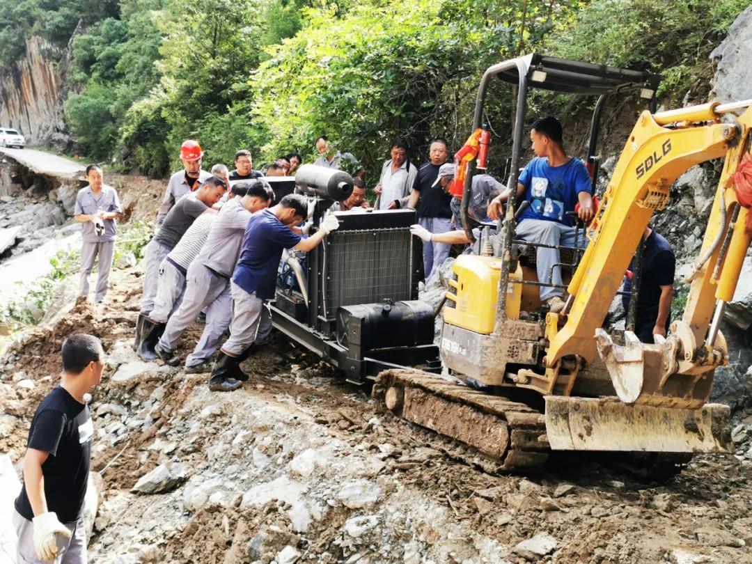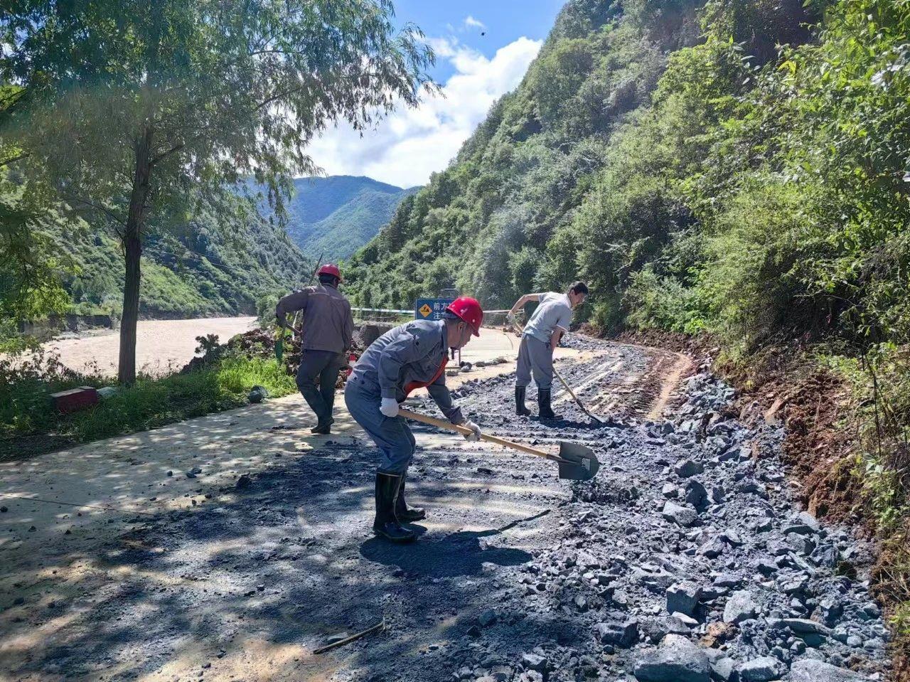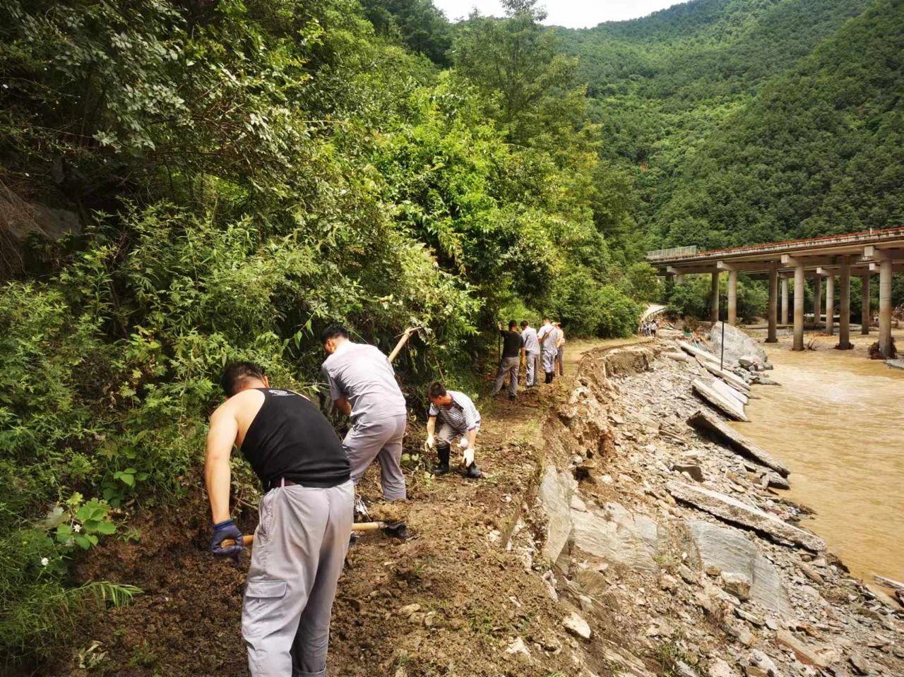 7月19日,四方金礦職工支援坪坎鎮(zhèn)對(duì)坍塌的路基、受損路面和重要路段進(jìn)行修復(fù)。