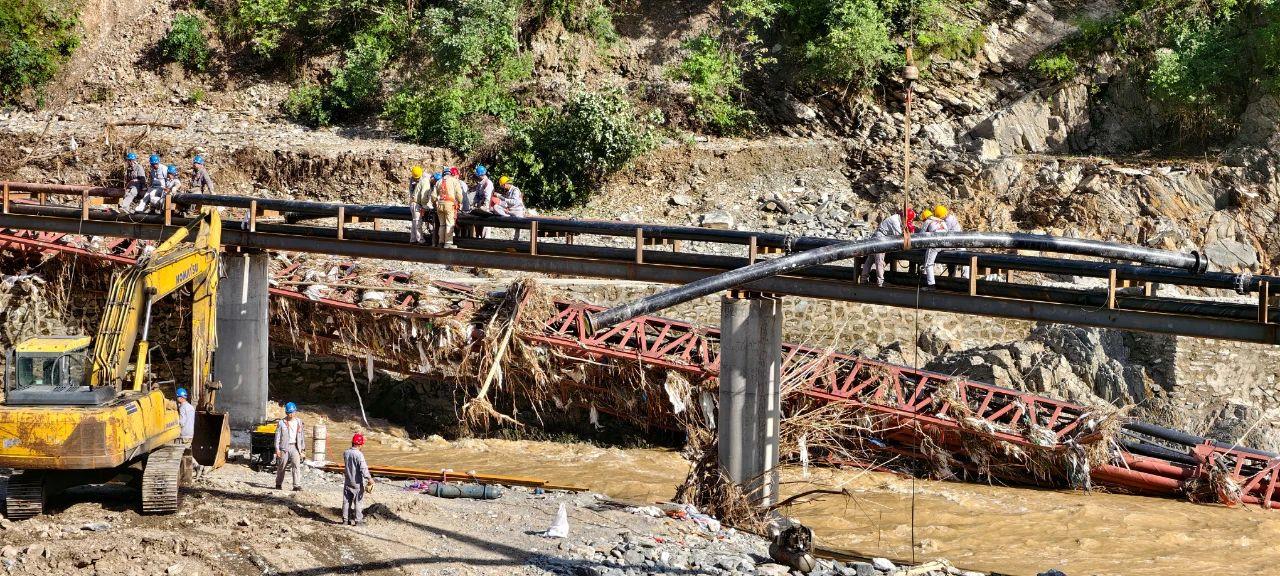 7月25日,四方金礦職工正在河道上架設(shè)受損的尾礦管道。