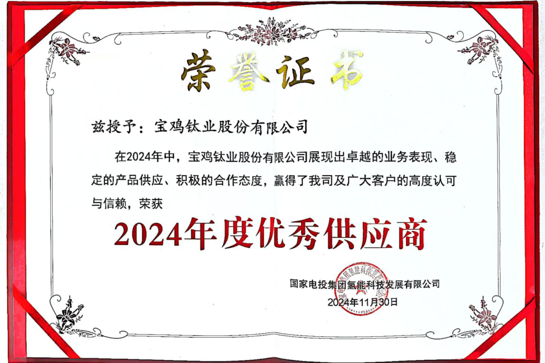 近日,在國家電投集團氫能科技發(fā)展有限公司(以下簡稱國氫科技)供應(yīng)商評比中,寶鈦股份從百余家供應(yīng)商中脫穎而出,榮獲“優(yōu)秀供應(yīng)商”稱號,且為五家“優(yōu)秀供應(yīng)商”中唯一一家鈦材供應(yīng)商。