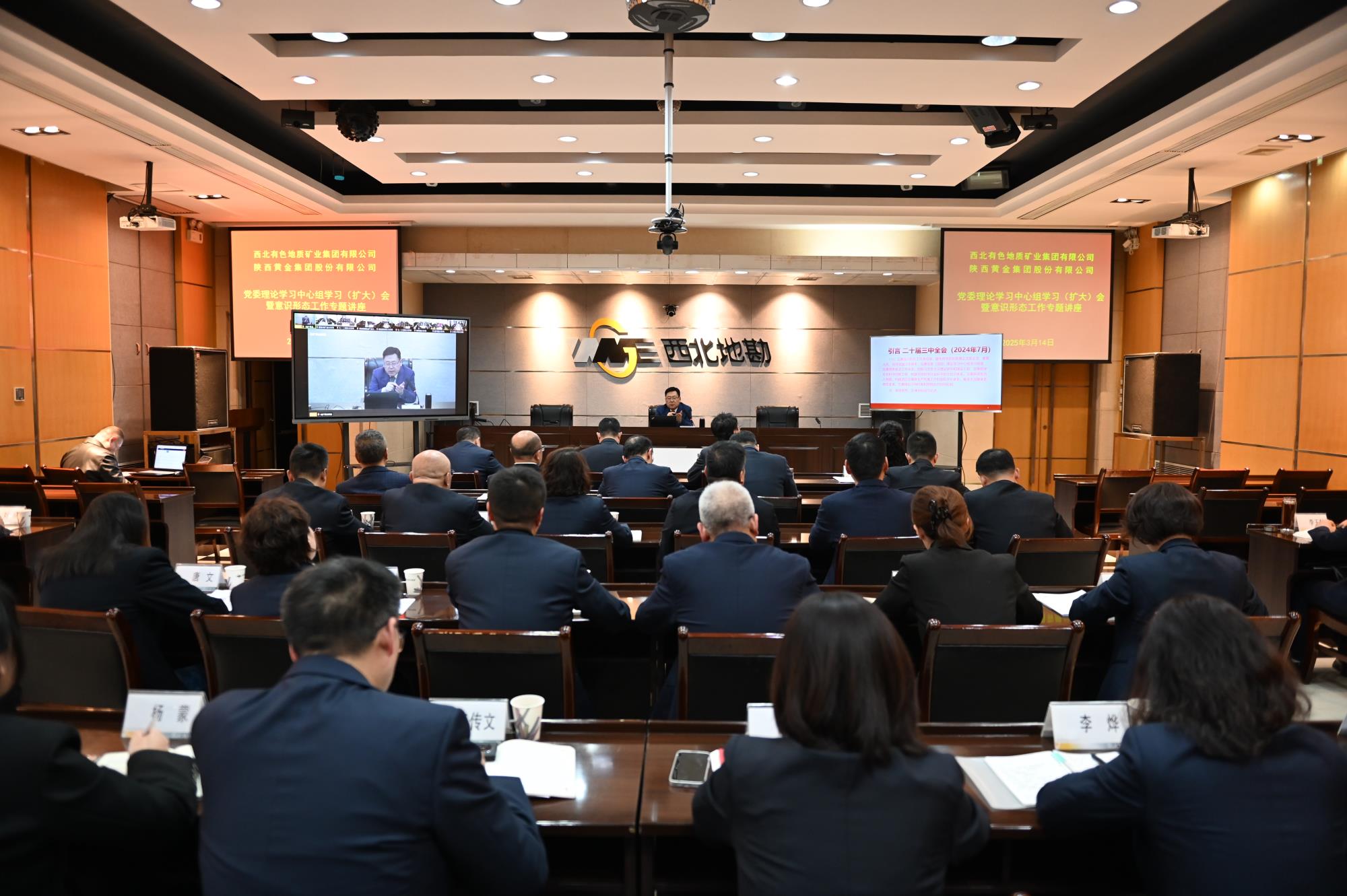 3月14日,地礦集團(tuán)黨委、黃金集團(tuán)黨委召開2025年第3次理論學(xué)習(xí)中心組集體學(xué)習(xí)(擴(kuò)大)會暨意識形態(tài)工作專題講座,認(rèn)真?zhèn)鬟_(dá)學(xué)習(xí)習(xí)近平總書記在全國兩會期間的重要講話和全國兩會精神,深入學(xué)習(xí)貫徹習(xí)近平總書記關(guān)于意識形態(tài)工作的重要論述,逐級夯實(shí)意識形態(tài)工作責(zé)任制,筑牢高質(zhì)量發(fā)展思想根基。兩集團(tuán)黨委書記、董事長秦西社主持會議并講話。黃金集團(tuán)黨委副書記、董事、總經(jīng)理龔甦文領(lǐng)學(xué)有關(guān)內(nèi)容。