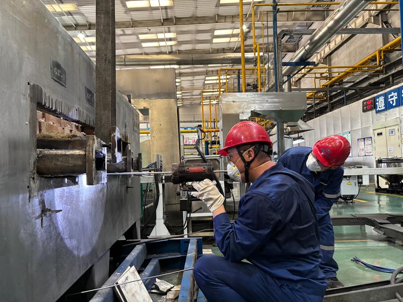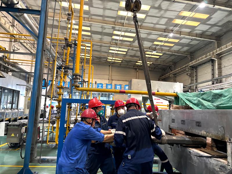 爐管更換是一項兼具繁重體力與精細技術的綜合性任務,不僅需要拆卸爐管、徹底清理爐膛,還要精準安裝新爐管并完成設備調(diào)試。既要克服重型部件搬運的強度挑戰(zhàn),又需要確保每一步裝配的毫米級精度,最終實現(xiàn)設備高效穩(wěn)定運行。在悶熱如蒸籠的作業(yè)環(huán)境中,員工們揮汗如雨,卻始終斗志昂揚?!半m然天氣熱,但生產(chǎn)任務不能耽誤,我們早一分鐘完成,后續(xù)生產(chǎn)就多一份保障!”員工樸實的話語詮釋了鉬粉分廠員工的責任與擔當。