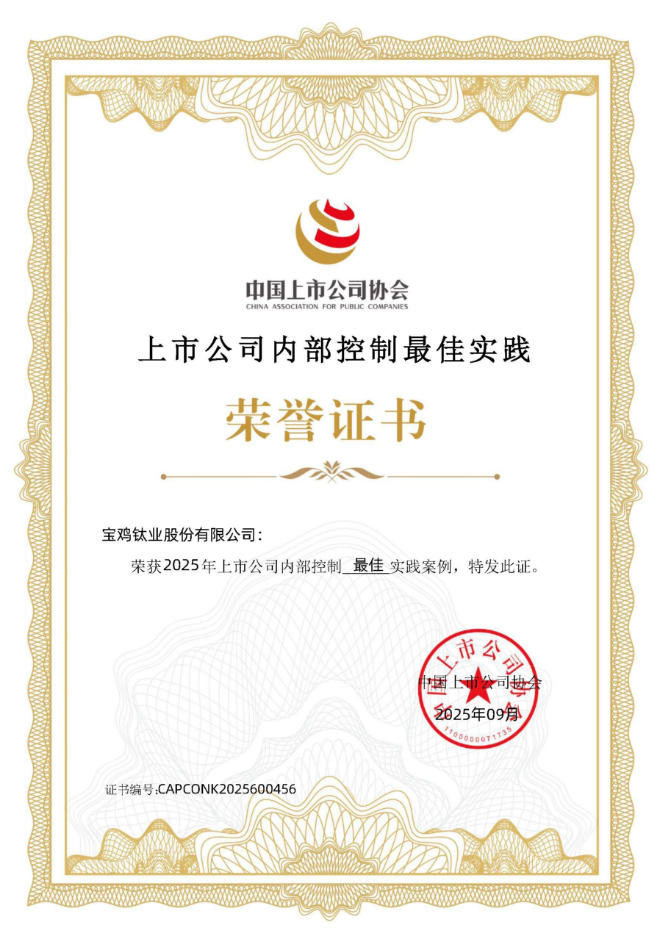 內(nèi)部控制是規(guī)范企業(yè)經(jīng)營管理活動(dòng)、防范內(nèi)外部風(fēng)險(xiǎn)、提升管理效率和效果、保障戰(zhàn)略目標(biāo)實(shí)現(xiàn)的關(guān)鍵機(jī)制。上市公司內(nèi)部控制最佳實(shí)踐案例征集評(píng)選,能夠有效發(fā)揮優(yōu)秀案例示范效應(yīng),激發(fā)上市公司內(nèi)生動(dòng)力,構(gòu)建公司治理生態(tài)圈,打造內(nèi)控實(shí)踐的“中國范式”。寶鈦股份在眾多申報(bào)單位中脫穎而出,充分展示了公司在內(nèi)部控制機(jī)制創(chuàng)新、實(shí)踐成效和政策響應(yīng)等方面的卓越表現(xiàn),彰顯了公司在內(nèi)控工作中的深入探索和扎實(shí)積累。