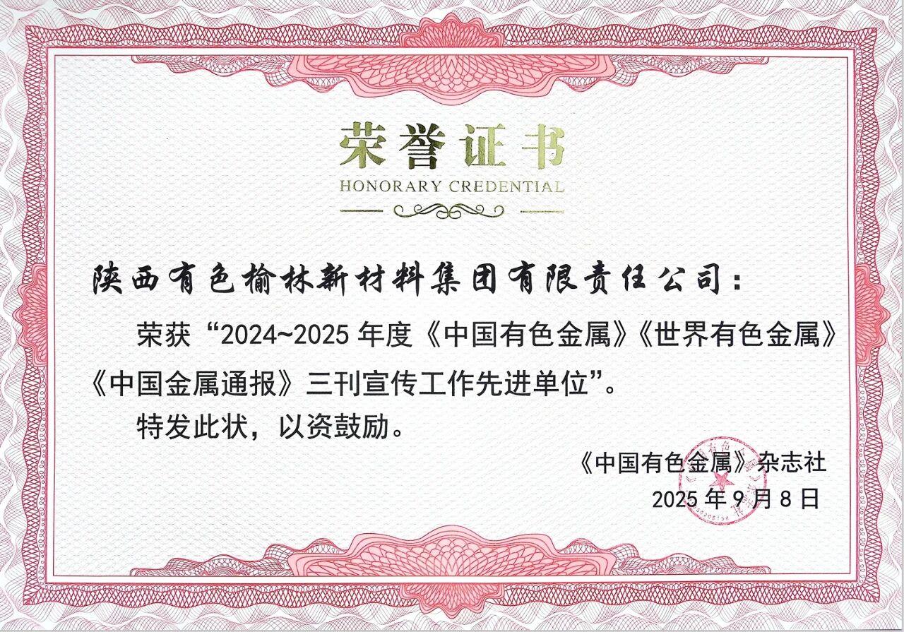 近日,從《中國有色金屬》《世界有色金屬》《中國金屬通報》三刊特約通訊員、《中國有色金屬工業(yè)年鑒》撰稿人工作會上獲悉,榆林新材料集團以優(yōu)異的宣傳工作成效,榮獲2024-2025年度《中國有色金屬》雜志社三刊宣傳工作先進(jìn)單位。