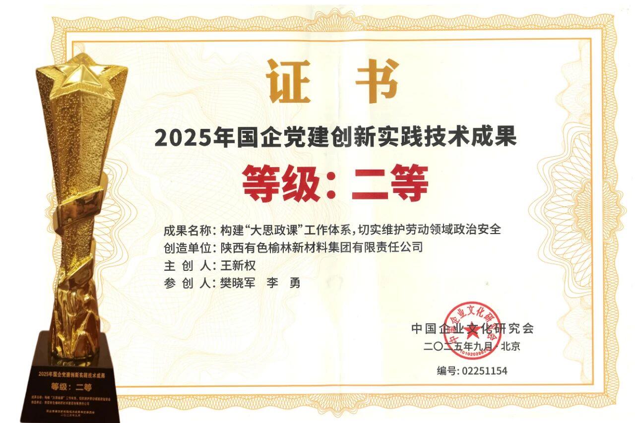 近日,2025年國(guó)企黨建創(chuàng)新實(shí)踐交流會(huì)在北京召開。會(huì)上,公布了“2025年國(guó)企黨建創(chuàng)新實(shí)踐技術(shù)成果”評(píng)選結(jié)果。榆林新材料集團(tuán)黨委申報(bào)的黨建創(chuàng)新成果《構(gòu)建“大思政課”工作體系,切實(shí)維護(hù)勞動(dòng)領(lǐng)域政治安全》憑借突出的創(chuàng)建成效,獲評(píng)“2025年國(guó)企黨建創(chuàng)新實(shí)踐技術(shù)成果”第二等級(jí)。