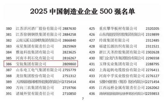 寶鈦集團(tuán)首次榮登“中國(guó)制造業(yè)企業(yè)500強(qiáng)”
