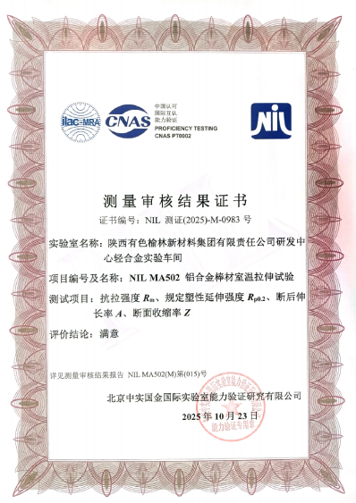 近日,榆林新材料集團研發(fā)中心鋁合金中化學成分分析、鋁合金棒材室溫拉伸測定、粉末粒度分析(激光衍射法)測定三個項目順利通過國家CNAS實驗室測量審核能力驗證,評價結(jié)果均為“滿意”,并獲得能力驗證證書,證明其檢測技術(shù)能力已符合中國合格評定國家認可委員會(CNAS)實驗室認可要求。