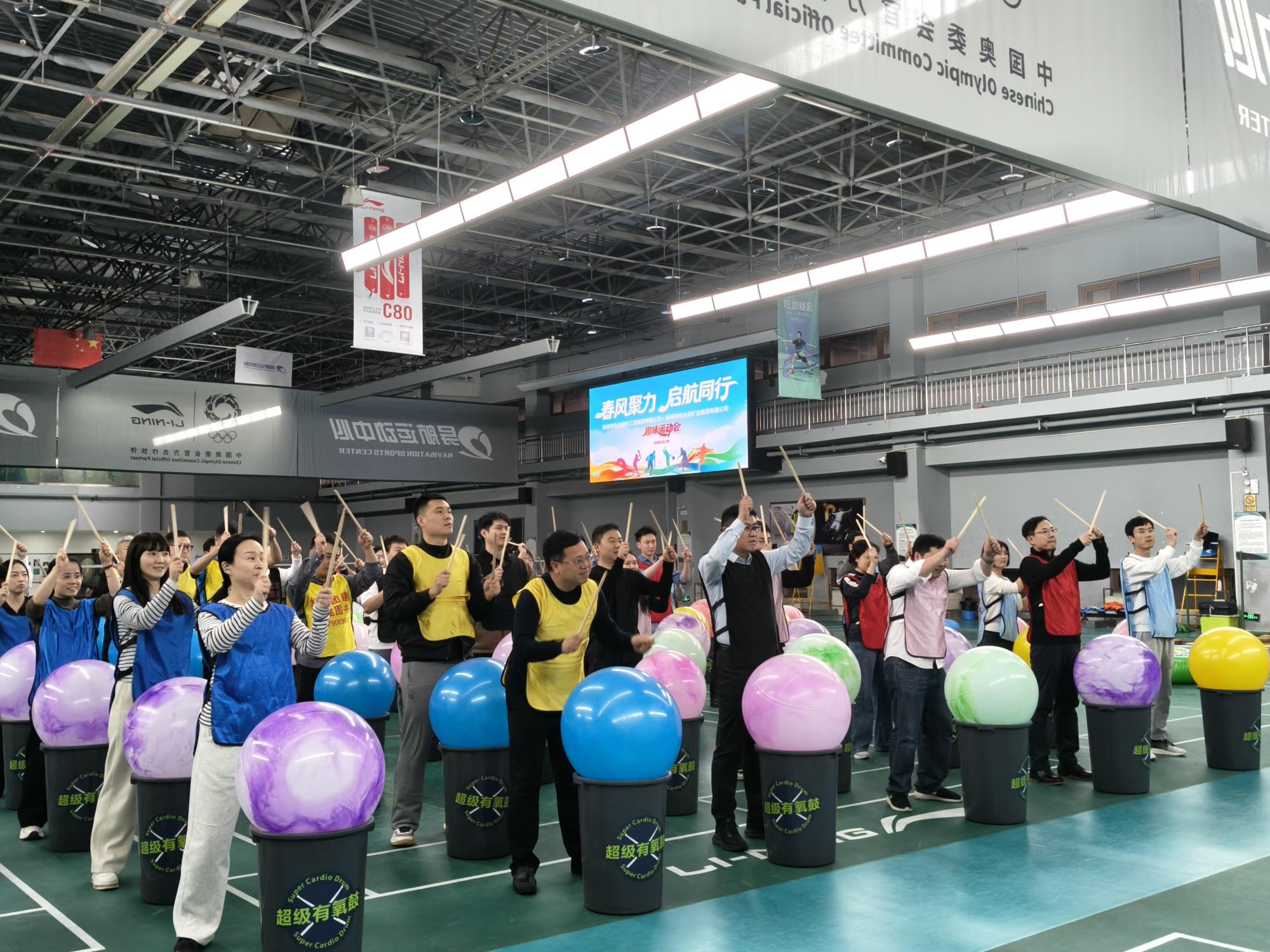 超級有氧鼓作為全員沉浸式主題項目,瞬間點燃賽場氛圍。在專業(yè)教練的指導下,大家從基礎的鼓棒握法、敲擊學起,簡單的技法演練讓久坐辦公的職工們快速放松身心、舒展肢體。伴隨著陜北民歌《山丹丹開花紅艷艷》的旋律,鏗鏘的鼓點此起彼伏,節(jié)奏整齊劃一。各代表隊手持創(chuàng)編音樂卡,自主設計鼓點節(jié)奏與肢體律動,將團隊創(chuàng)意融入鼓舞表演,輪番上場展示時,或激昂澎湃或輕快靈動,每一段特色樂章都贏得滿堂喝彩,評委們從節(jié)奏把控、團隊協(xié)作、創(chuàng)意編排等維度現(xiàn)場打分,盡顯各隊風采。最后全體職工同心合奏《歌唱祖國》,恢宏的鼓點響徹賽場,成為整場運動會的暖心高光時刻。