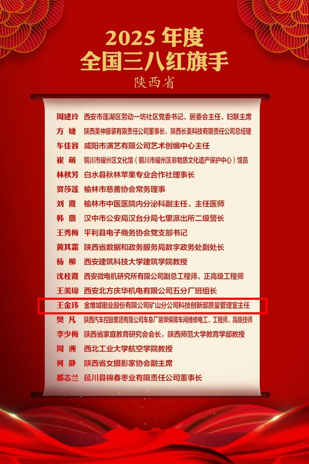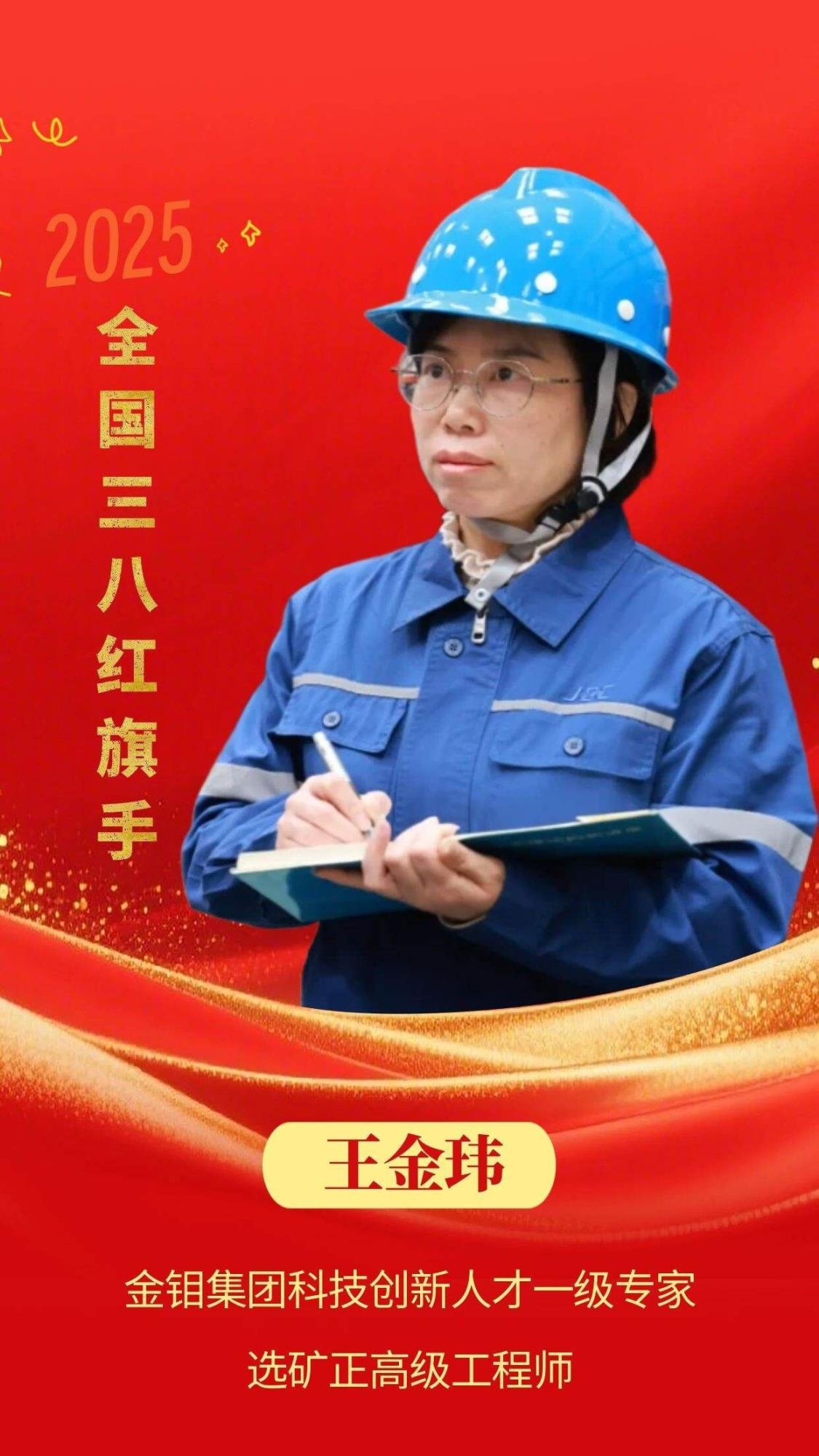 3月2日,中華全國(guó)婦女聯(lián)合會(huì)發(fā)布2025年度全國(guó)三八紅旗手標(biāo)兵、全國(guó)三八紅旗手、全國(guó)三八紅旗集體、全國(guó)巾幗文明崗名單,陜西省共有19名個(gè)人和12個(gè)集體獲2025年度全國(guó)三八紅旗手和全國(guó)三八紅旗集體表彰。金鉬集團(tuán)科技創(chuàng)新人才一級(jí)專家、選礦正高級(jí)工程師王金瑋被授予“全國(guó)三八紅旗手”稱號(hào)。