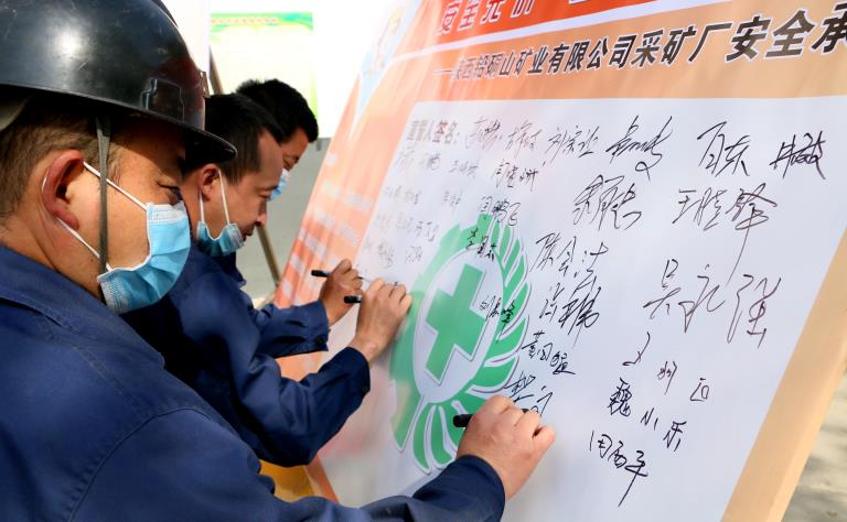 開展儀式上,公司采礦廠及兩個外包作業(yè)項目部50余名生產(chǎn)骨干集體簽名承諾安全,并作出莊嚴宣誓?!拔业陌踩邑撠煟び训陌踩矣胸?,公司的安全我盡責……”錚錚誓言回聲嘹亮,表達著對生命的敬畏,對責任的擔當。
