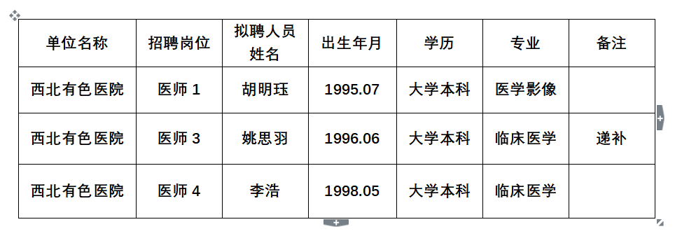 西北有色醫(yī)院2021年省屬事業(yè)單位公開招聘體檢、考察環(huán)節(jié)已經(jīng)結(jié)束,依據(jù)《事業(yè)單位人事管理?xiàng)l例》《陜西省事業(yè)單位公開招聘工作人員實(shí)施辦法》及2021年陜西省省屬事業(yè)單位公開招聘工作人員公告要求,現(xiàn)將西北有色醫(yī)院擬聘人員名單公示如下: