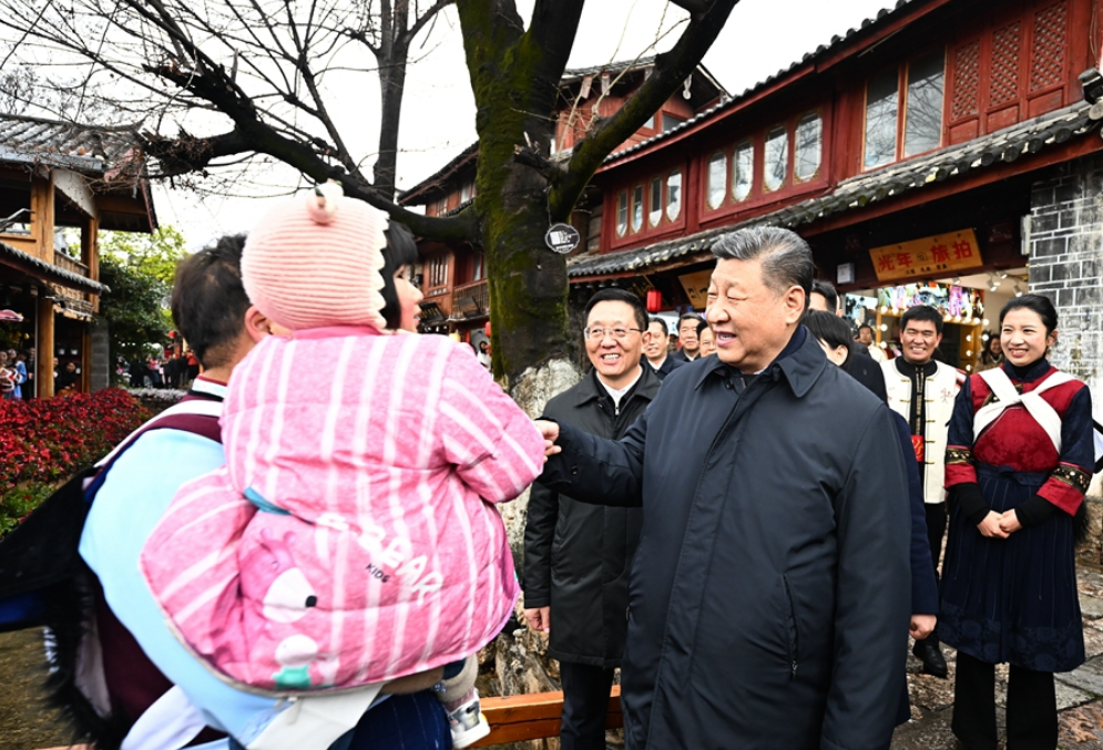 麗江古城有800多年歷史,被列入世界文化遺產(chǎn)名錄。一場春雪過后,麗江游人如織。習(xí)近平來到這里,詳細了解古城營建歷史、納西族民居特色和當(dāng)?shù)匚幕z產(chǎn)保護利用、推動文旅融合發(fā)展等情況。居民和游客見到總書記十分興奮,爭相問好,有的還彈奏樂器、載歌載舞歡迎總書記。習(xí)近平頻頻與大家互動交流,了解商鋪經(jīng)營狀況和游客感受。他要求當(dāng)?shù)靥幚砗帽Wo和發(fā)展的關(guān)系,讓這座美麗的古城煥發(fā)新的光彩。