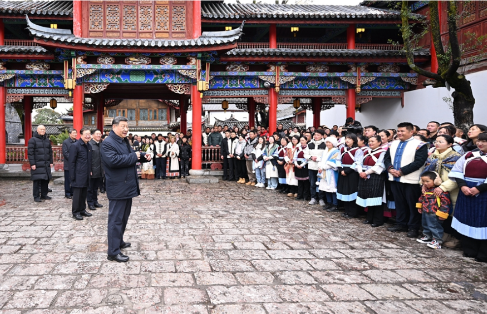 古城內(nèi)的木氏土司府衙署見證了西南地區(qū)各民族交往交流交融的歷史。習(xí)近平察看木府主要建筑,參觀納西族東巴文化研究成果展示。他強調(diào),要保護利用好木府這樣的重要文化地標(biāo),保護傳承好中華優(yōu)秀傳統(tǒng)文化,引導(dǎo)各族群眾自覺鑄牢中華民族共同體意識,不斷推進中華民族共同體建設(shè)。