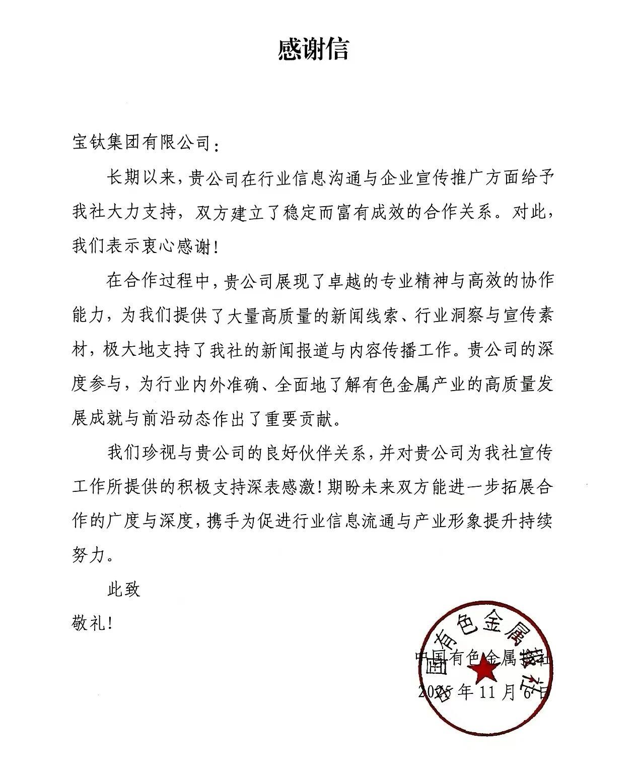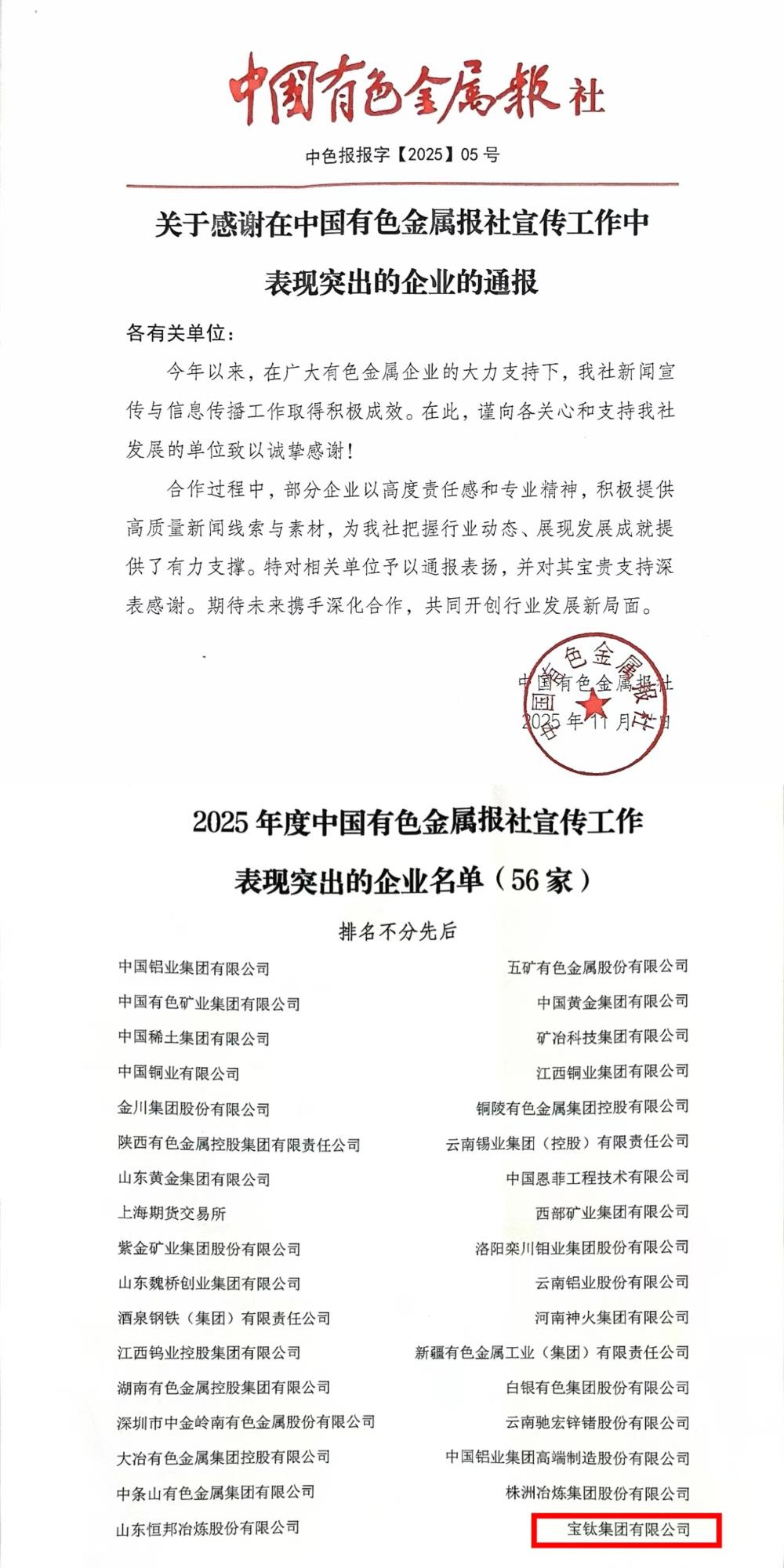在近日召開的中國(guó)有色金屬報(bào)社2025年宣傳工作會(huì)議上,寶鈦集團(tuán)被評(píng)為宣傳工作表現(xiàn)突出企業(yè),寶鈦集團(tuán)文化新聞中心王丹被評(píng)為宣傳工作表現(xiàn)突出個(gè)人,獲得通報(bào)表?yè)P(yáng)。