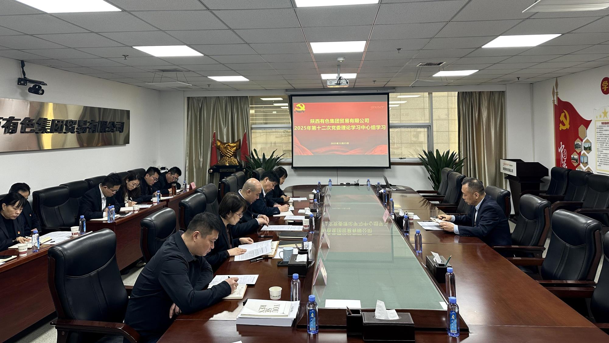 12月25日,貿(mào)易公司召開2025年黨委理論學(xué)習(xí)中心組第12次學(xué)習(xí)會(huì)議。陜西有色金屬集團(tuán)黨委委員、副總經(jīng)理趙黎明到會(huì)旁聽督導(dǎo),貿(mào)易公司黨委書記石正軍主持會(huì)議。