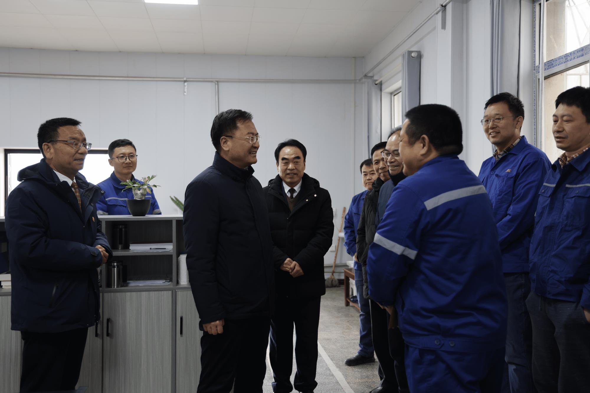 在王國順當(dāng)班的一區(qū)值班室,嚴(yán)平聽取了采場生產(chǎn)工藝以及調(diào)度室人員值班等情況介紹,對(duì)王國順多年來扎根一線、默默奉獻(xiàn)的精神表示感謝,勉勵(lì)他要繼續(xù)發(fā)揮先鋒模范作用,帶領(lǐng)團(tuán)隊(duì)為推動(dòng)公司高質(zhì)量發(fā)展貢獻(xiàn)智慧和力量。