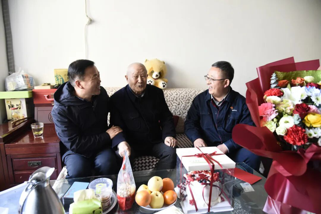 隨后,賀書記一行到老黨員劉兆華、李玉、蔡俊山家中走訪。每到一戶,賀治民都與老黨員們拉家常、問近況,細致了解他們的生活需求和健康情況,認真聆聽老同志們講述往昔在崗位上攻堅克難、敬業(yè)奉獻的奮斗故事;在百歲老人蔡俊山家中,特意送去帶有美好祝愿的定制蛋糕,叮囑老人家屬悉心照料日常起居,讓老人安享幸福晚年。