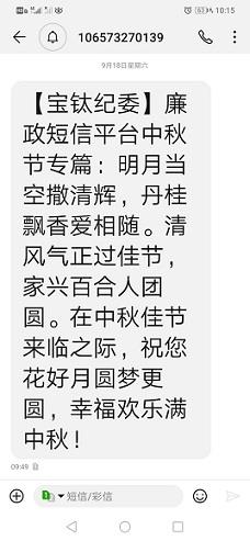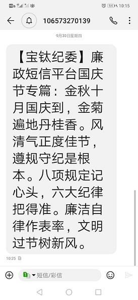 寶鈦集團(tuán)紀(jì)委利用寶鈦啟明星微信公眾號(hào)、寶鈦OA協(xié)同網(wǎng)等新媒體平臺(tái),轉(zhuǎn)載中央紀(jì)委國(guó)家監(jiān)委在中秋、國(guó)慶節(jié)前通報(bào)曝光的違反中央八項(xiàng)規(guī)定精神典型案例,在利用反面典型開(kāi)展警示教育的同時(shí),一改往日說(shuō)教式短信的文風(fēng),結(jié)合中秋、國(guó)慶的節(jié)日特點(diǎn),自編原創(chuàng)以廉潔過(guò)節(jié)為主題的“打油詩(shī)”。9月18日,以“明月當(dāng)空灑清輝,丹桂飄香愛(ài)相隨。清風(fēng)氣正過(guò)佳節(jié),家興百合人團(tuán)圓。在中秋佳節(jié)來(lái)臨之際,祝您花好月圓夢(mèng)更圓,幸福歡樂(lè)滿(mǎn)中秋”為內(nèi)容;9月30日,以“金秋十月國(guó)慶到,金菊遍地丹桂香。風(fēng)清氣正度佳節(jié),遵規(guī)守紀(jì)是根本。八項(xiàng)規(guī)定記心頭,六大紀(jì)律把得準(zhǔn)。廉潔自律作表率,文明過(guò)節(jié)樹(shù)新風(fēng)”為內(nèi)容,通過(guò)寶鈦廉政短信平臺(tái)向公司全體中層及以上干部發(fā)送節(jié)前提醒短信2條、共450人次。