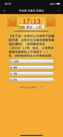 活動中,該廠副科級以上干部和重點(diǎn)崗位人員近百人通過關(guān)注微信公眾號“您有問題我來答”完成了答題。題目內(nèi)容圍繞《關(guān)于進(jìn)一步規(guī)范公司領(lǐng)導(dǎo)干部履職待遇、業(yè)務(wù)支出及婚喪嫁娶等事宜的通知》《金堆城鉬業(yè)集團(tuán)有限公司紀(jì)律處分決定執(zhí)行工作規(guī)定(暫行)》《中共金堆城鉬業(yè)股份有限公司委員會貫徹落實(shí)中央八項(xiàng)規(guī)定實(shí)施細(xì)則精神的具體辦法》等13項(xiàng)黨風(fēng)廉政建設(shè)制度,通過選擇、判斷兩種題型,深度檢測黨員干部了解、掌握制度的基本情況,該廠紀(jì)委在答題結(jié)束后還針對易錯(cuò)題進(jìn)行了跟蹤輔導(dǎo)。