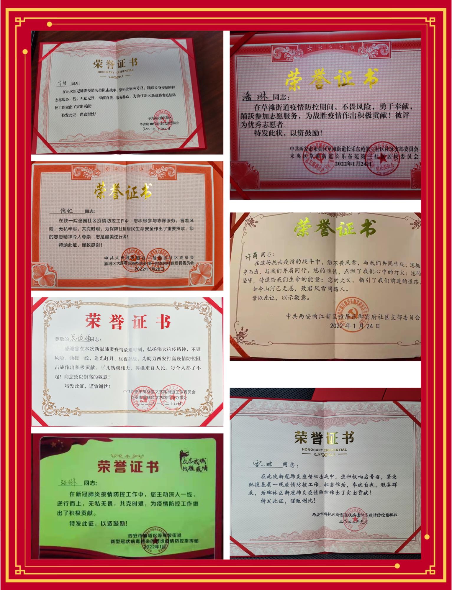近日,測繪路、文藝路、曲江等多家社區(qū)向地礦(黃金)集團(tuán)15名紀(jì)檢干部頒發(fā)了抗擊疫情榮譽證書,以表彰在疫情防控工作中做出的貢獻(xiàn),同時也希望他們繼續(xù)弘揚偉大抗疫精神,扛起職責(zé)使命,為社會奉獻(xiàn)力量。
